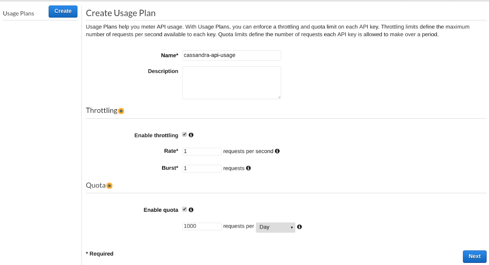 Once you have access to the create button, create your Usage Plan, and associate it with the cassandra-api API, with the test Stage. Then associate the Usage Plan with the API key you created.