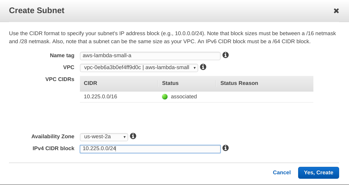 You will want to do that to achieve High Availability with your AWS Lambda. In my case, I use the subnet CIDR block as follow: 10.225.0.0/24 for us-west-2a; 10.225.1.0/24 for us-west-2b; and 10.225.2.0/24 for us-west-2c.