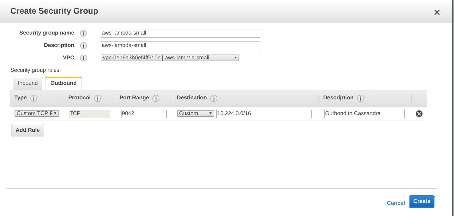 You need to create a security group for you AWS Lambda as the Lambda containers will be executed in the VPC. At a minimum, a lot of outbound traffic to TCP port 9042 (Cassandra port) towards your Cassandra cluster, in my case 10.224.0.0/16