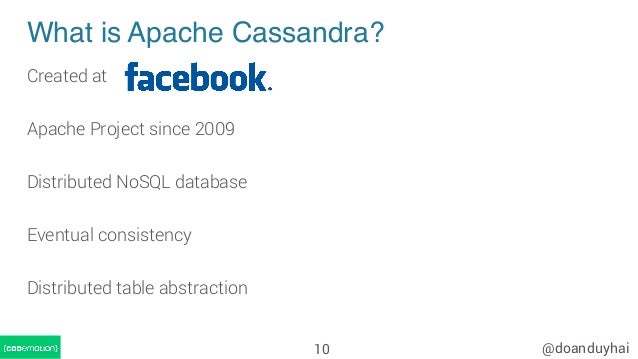 - 10. @doanduyhai What is Apache Cassandra? Created at Apache Project since 2009 Distributed NoSQL database Eventual consistency Distributed table abstraction 10