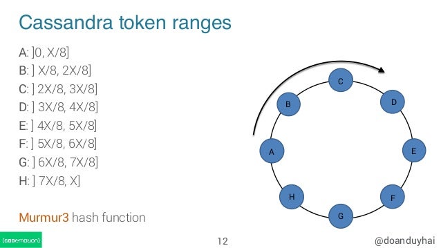- 12. @doanduyhai Cassandra token ranges A: ]0, X/8] B: ] X/8, 2X/8] C: ] 2X/8, 3X/8] D: ] 3X/8, 4X/8] E: ] 4X/8, 5X/8] F: ] 5X/8, 6X/8] G: ] 6X/8, 7X/8] H: ] 7X/8, X] Murmur3 hash function n1 n2 n3 n4 n5 n6 n7 n8 A B C D E F G H 12
