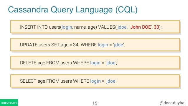 - 15. @doanduyhai Cassandra Query Language (CQL) INSERT INTO users(login, name, age) VALUES(‘jdoe’, ‘John DOE’, 33); UPDATE users SET age = 34 WHERE login = ‘jdoe’; DELETE age FROM users WHERE login = ‘jdoe’; SELECT age FROM users WHERE login = ‘jdoe’; 15