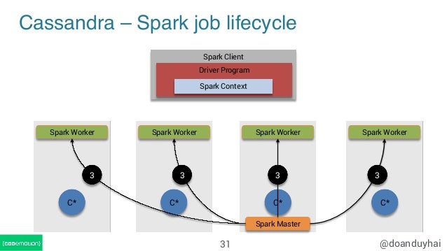 - 30. @doanduyhai Cassandra – Spark job lifecycle Spark Worker Spark Worker Spark Worker Spark Worker C* C* C* C* 30 Spark Master Spark Client Driver Program Spark Context 2