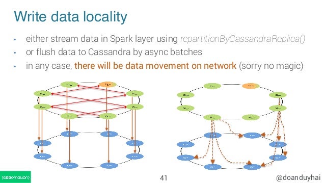 - 41. @doanduyhai Write data locality • either stream data in Spark layer using repartitionByCassandraReplica() • or flush data to Cassandra by async batches • in any case, there will be data movement on network (sorry no magic) 41