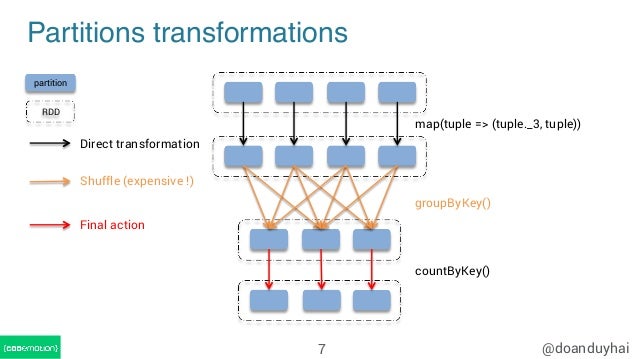 - 7. @doanduyhai Partitions transformations map(tuple => (tuple._3, tuple)) Direct transformation Shuffle (expensive !) groupByKey() countByKey() partition RDD Final action 7