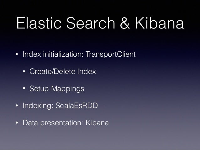 - 13. Elastic Search & Kibana • Index initialization: TransportClient • Create/Delete Index • Setup Mappings • Indexing: ScalaEsRDD • Data presentation: Kibana