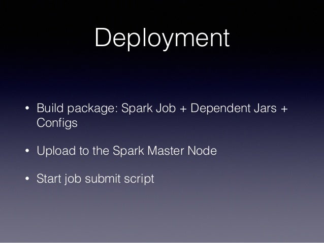 - 15. Deployment • Build package: Spark Job + Dependent Jars + Configs • Upload to the Spark Master Node • Start job submit script
