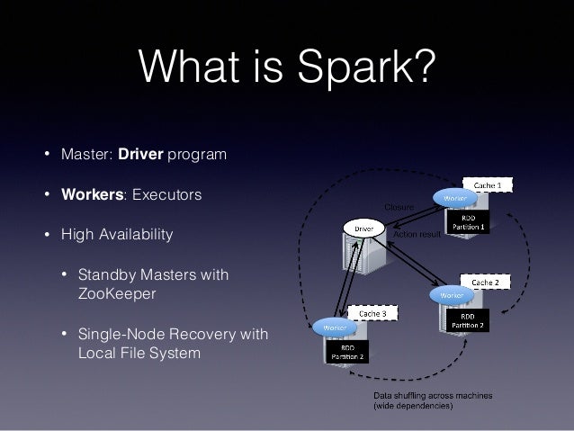 - 2. What is Spark? • Master: Driver program • Workers: Executors • High Availability • Standby Masters with ZooKeeper • Single-Node Recovery with Local File System