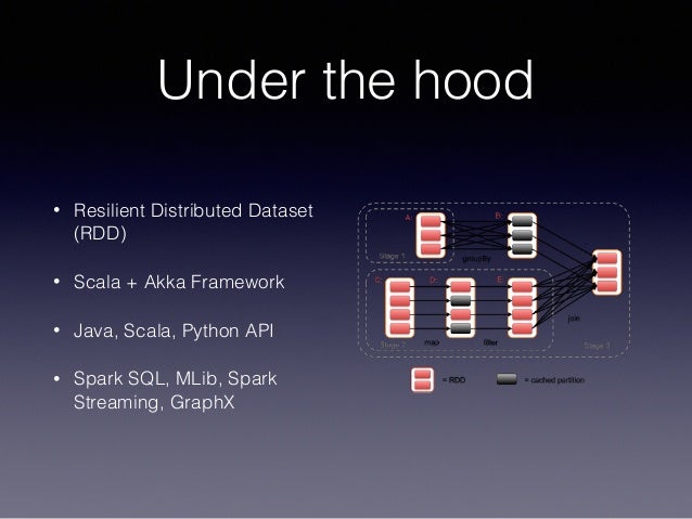 - 3. Under the hood • Resilient Distributed Dataset (RDD) • Scala + Akka Framework • Java, Scala, Python API • Spark SQL, MLib, Spark Streaming, GraphX