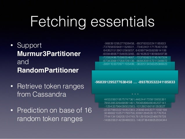 - 8. Fetching essentials … … … … -968391295277638458 … -893783532241185833 -968391295277638458, -893783532241185833 -7378580094811526501, -7340240117176401239 6426215139012569257, 6428979455828914106 -6094480671546553265, -6016282219056649738 -7259249675596554667, -7237838231745167324 -6734336817058726139, -6684208157211348972 -3891103372671105499, -3822513456325086923 4453206019575747361,4462441725813855391 7855385326468991461,7906589648045207141 -129433796439502583,-101280166181350027 -2233788032218452383,-2066644620711092198 3248662132571799756,3396129453515776704 7744134136205124749,7812918342246679728 -1408208314239486033,-1403736406052004344 • Support Murmur3Partitioner and RandomPartitioner • Retrieve token ranges from Cassandra • Prediction on base of 16 random token ranges