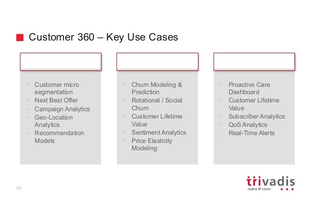 - 10. Customer 360 – Key Use Cases • Customer micro segmentation • Next Best Offer • Campaign Analytics • Geo-Location Analytics • Recommendation Models • Churn Modeling & Prediction • Rotational / Social Churn • Customer Lifetime Value • Sentiment Analytics • Price Elasticity Modeling • Proactive Care Dashboard • Customer Lifetime Value • Subscriber Analytics • QoS Analytics • Real-Time Alerts Target Marketing & Personalization Churn Prevention & Customer Retention Proactive Care 10