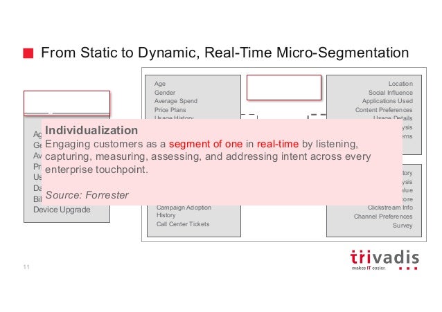 - 11. From Static to Dynamic, Real-Time Micro-Segmentation Age Gender Average Spend Price Plans Usage History Data, Voice, Text Billing History Device Upgrade Traditional Segmentation Age Gender Average Spend Price Plans Usage History Data, Voice, Text Billing History Device Upgrade Device History Other products / services Bundling preferences Offer History Campaign Adoption History Call Center Tickets Location Social Influence Applications Used Content Preferences Usage Details Roaming Analysis Travel Patterns QoS History Household Analysis Lifetime Value Churn Score Clickstream Info Channel Preferences Survey Real-Time Micro- Segmentation 11 Individualization Engaging customers as a segment of one in real-time by listening, capturing, measuring, assessing, and addressing intent across every enterprise touchpoint. Source: Forrester
