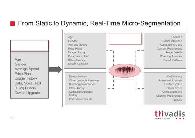 - 12. From Static to Dynamic, Real-Time Micro-Segmentation Age Gender Average Spend Price Plans Usage History Data, Voice, Text Billing History Device Upgrade Traditional Segmentation Age Gender Average Spend Price Plans Usage History Data, Voice, Text Billing History Device Upgrade Device History Other products / services Bundling preferences Offer History Campaign Adoption History Call Center Tickets Location Social Influence Applications Used Content Preferences Usage Details Roaming Analysis Travel Patterns QoS History Household Analysis Lifetime Value Churn Score Clickstream Info Channel Preferences Survey Real-Time Micro- Segmentation 12