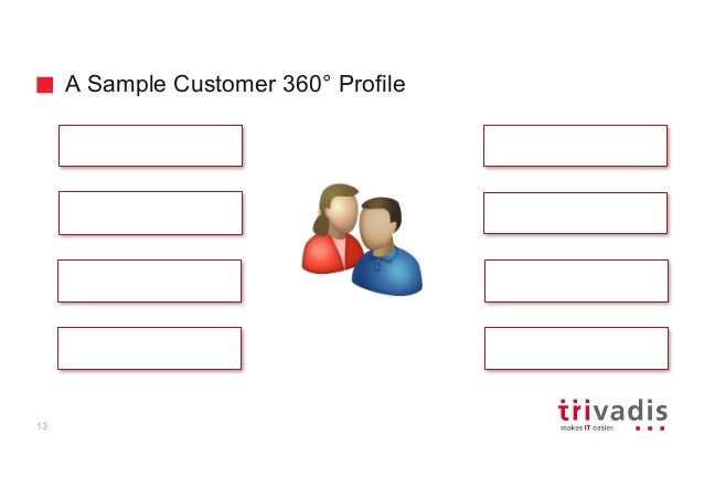 - 13. A Sample Customer 360° Profile Who are you? Where are you? What have you purchased? What content do you prefer? Who do you know? What can you afford? What is your value to the business? How / why have you contacted us? 13