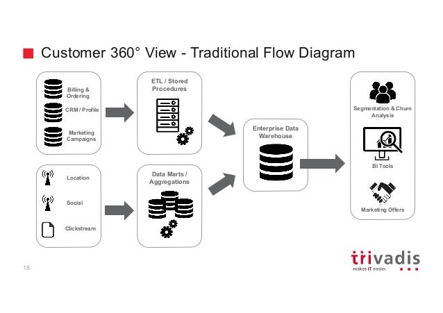 - 16. Customer 360° View - Traditional Flow Diagram Enterprise Data Warehouse ETL / Stored Procedures Data Marts / Aggregations Location Social Clickstream Segmentation & Churn Analysis BI Tools Marketing Offers Billing & Ordering CRM / Profile Marketing Campaigns 18