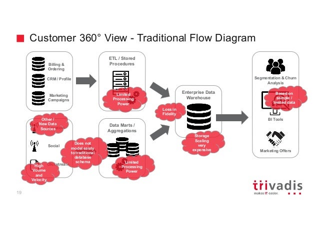 - 17. Customer 360° View - Traditional Flow Diagram Enterprise Data Warehouse ETL / Stored Procedures Data Marts / Aggregations Location Social Clickstream Segmentation & Churn Analysis BI Tools Marketing Offers Billing & Ordering CRM / Profile Marketing Campaigns Limited Processing Power Does not model easily to traditional database schema Limited Processing Power Storage Scaling very expensive Based on sample / limited data Loss in Fidelity Other / New Data Sources High Voume and Velocity 19