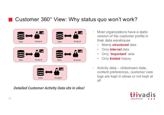 - 18. Customer 360° View: Why status quo won’t work? • Most organizations have a static version of the customer profile in their data warehouse • Mainly structured data • Only internal data • Only “important” data • Only limited history • Activity data – clickstream data, content preferences, customer care logs are kept in siloes or not kept at all Data Analyst Data Analyst Data Analyst Data Analyst Data Analyst Detailed Customer Activity Data sits in silos! 20