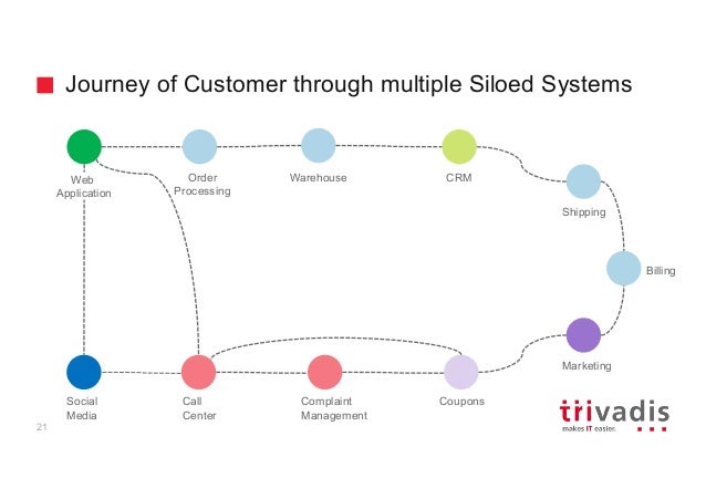 - 20. Journey of Customer through multiple Siloed Systems 22 Social Media Call Center Complaint Management Marketing Coupons Warehouse CRM Shipping Billing Order Processing Web Application
