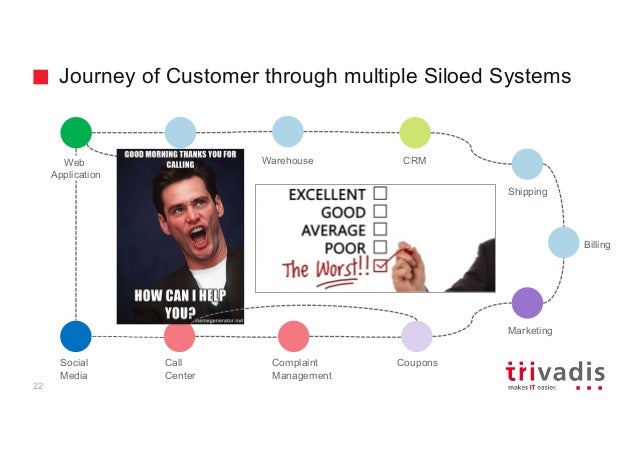 - 19. Journey of Customer through multiple Siloed Systems 21 Social Media Call Center Complaint Management Marketing Coupons Warehouse CRM Shipping Billing Order Processing Web Application