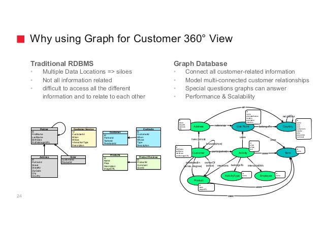 - 22. Why using Graph for Customer 360° View 24 Traditional RDBMS • Multiple Data Locations => siloes • Not all information related • difficult to access all the different information and to relate to each other Graph Database • Connect all customer-related information • Model multi-connected customer relationships • Special questions graphs can answer • Performance & Scalability Partner Id FirstName LastName BirthDate ProfileImageURL Id CustomerId When Where Type Description Contacts Address Id PartnerId Street StreetNr ZipCode City Country Id Name Price Description ImageURL Products CustomerId ProductId Order Id CustomerId When Where InteractionType Description Customer Service Id ProductId Comment UserId Product Reviews Id PartnerId TwitterId FacebookId Customer Geo Point Customer Address Product ownerOf (since) interestedIn (since, degree) lives (since) ActivityparticipatesIn Termuses uses Employee interactsWith reference id name id when where text id firstName lastName birthDate profileImageURL uses id name imageURL id street streetNr zipCode city id name alternateNames location population elevation Country neighbour belongsTo id name iso2 iso3 isoNumeric capital area population continent uses ActivityType id name belongsTo id name at knows(since) mentions uses