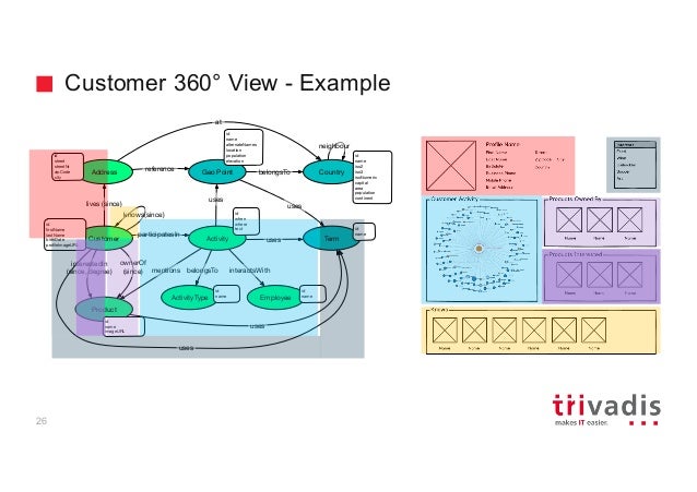 - 24. Geo Point Customer Address Product ownerOf (since) interestedIn (since, degree) lives (since) ActivityparticipatesIn Termuses uses Employee interactsWith reference id name id when where text id firstName lastName birthDate profileImageURL uses id name imageURL id street streetNr zipCode city id name alternateNames location population elevation Country neighbour belongsTo id name iso2 iso3 isoNumeric capital area population continent uses ActivityType id name belongsTo id name at knows(since) mentions uses Customer 360° View - Example 26