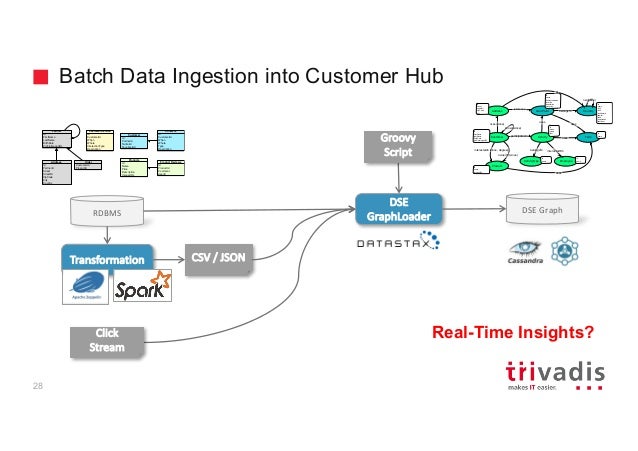 - 26. Batch Data Ingestion into Customer Hub DSE Graph DSE GraphLoaderRDBMS Groovy Script Click Stream 28 Geo Point Customer Address Product ownerOf (since) interestedIn (since, degree) lives (since) ActivityparticipatesIn Termuses uses Employee interactsWith reference id name id when where text id firstName lastName birthDate profileImageURL uses id name imageURL id street streetNr zipCode city id name alternateNames location population elevation Country neighbour belongsTo id name iso2 iso3 isoNumeric capital area population continent uses ActivityType id name belongsTo id name at knows(since) Transformation CSV / JSON Partner Id FirstName LastName BirthDate ProfileImageURL Id CustomerId When Where Type Description Contacts Address Id PartnerId Street StreetNr ZipCode City Country Id Name Price Description ImageURL Products CustomerId ProductId Order Id CustomerId When Where InteractionType Description Customer Service Id ProductId Comment UserId Product Reviews Id PartnerId TwitterId FacebookId Customer Real-Time Insights?