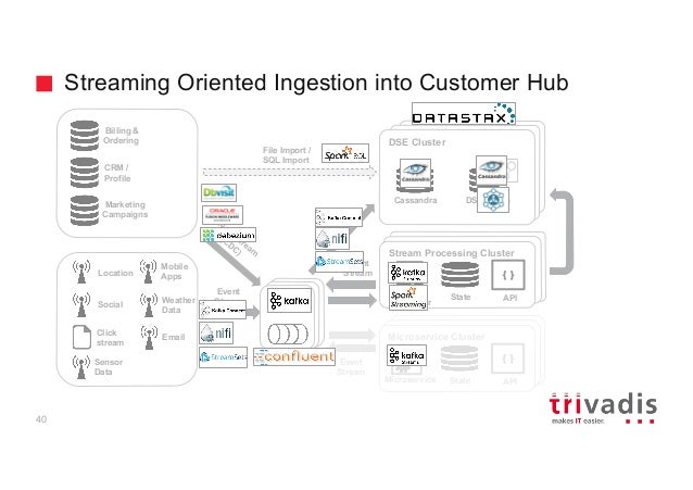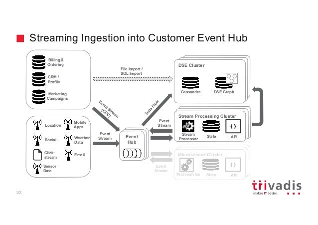 - 31. Streaming Oriented Ingestion into Customer Hub Microservice Cluster Microservice State { } API Stream Processing Cluster Stream Processor State { } API Billing & Ordering CRM / Profile Marketing Campaigns Location Social Click stream Sensor Data Weather Data Mobile Apps Email File Import / SQL Import Event Stream Event Hub Event Hub Event Hub Event Stream Event Stream Hadoop ClusterdHadoop Cluster DSE Cluster Cassandra DSE Graph 40