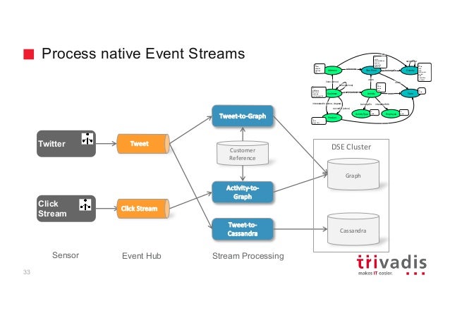 - 28. Process native Event Streams Twitter Tweet-to- Cassandra Cassandra Tweet Graph Tweet-to-Graph Customer Reference Click Stream Cllck Stream Activity-to- Graph DSE Cluster 33 Geo Point Customer Address Product ownerOf (since) interestedIn (since, degree) lives (since) ActivityparticipatesIn Termuses uses Employee interactsWith reference id name id when where text id firstName lastName birthDate profileImageURL uses id name imageURL id street streetNr zipCode city id name alternateNames location population elevation Country neighbour belongsTo id name iso2 iso3 isoNumeric capital area population continent uses ActivityType id name belongsTo id name at knows(since) Event Hub Stream ProcessingSensor