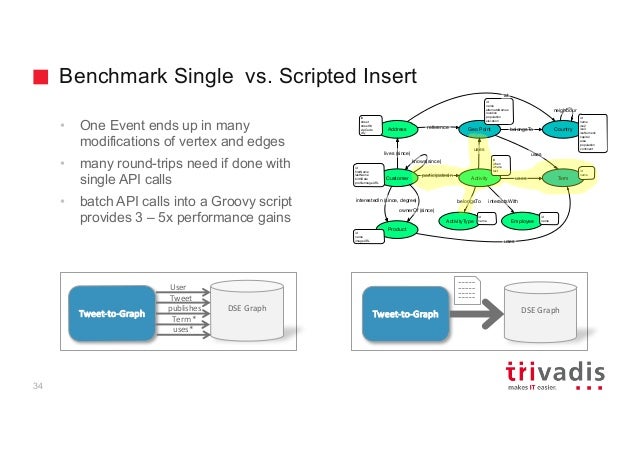 - 29. Benchmark Single vs. Scripted Insert 34 • One Event ends up in many modifications of vertex and edges • many round-trips need if done with single API calls • batch API calls into a Groovy script provides 3 – 5x performance gains DSE Graph Tweet-to-Graph Tweet User publishes Term * uses* DSE GraphTweet-to-Graph … ... Geo Point Customer Address Product ownerOf (since) interestedIn (since, degree) lives (since) ActivityparticipatesIn Termuses uses Employee interactsWith reference id name id when where text id firstName lastName birthDate profileImageURL uses id name imageURL id street streetNr zipCode city id name alternateNames location population elevation Country neighbour belongsTo id name iso2 iso3 isoNumeric capital area population continent uses ActivityType id name belongsTo id name at knows(since)
