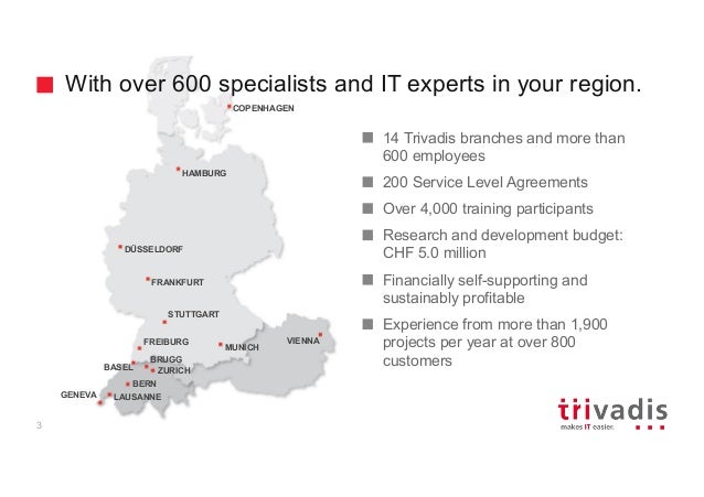 - 3. COPENHAGEN MUNICH LAUSANNE BERN ZURICH BRUGG GENEVA HAMBURG DÜSSELDORF FRANKFURT STUTTGART FREIBURG BASEL VIENNA With over 600 specialists and IT experts in your region. 14 Trivadis branches and more than 600 employees 200 Service Level Agreements Over 4,000 training participants Research and development budget: CHF 5.0 million Financially self-supporting and sustainably profitable Experience from more than 1,900 projects per year at over 800 customers 3