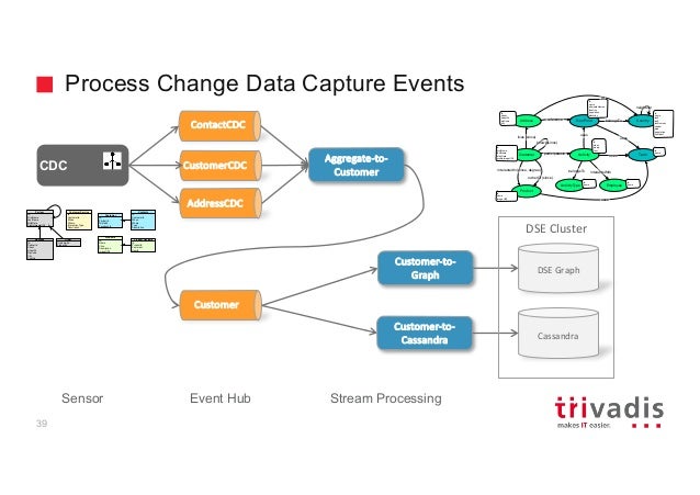 - 30. Process Change Data Capture Events CDC Customer-to- Cassandra Cassandra Customer DSE Graph Customer-to- Graph CustomerCDC AddressCDC ContactCDC Aggregate-to- Customer DSE Cluster 39 Geo Point Customer Address Product ownerOf (since) interestedIn (since, degree) lives (since) ActivityparticipatesIn Termuses uses Employee interactsWith reference id name id when where text id firstName lastName birthDate profileImageURL uses id name imageURL id street streetNr zipCode city id name alternateNames location population elevation Country neighbour belongsTo id name iso2 iso3 isoNumeric capital area population continent uses ActivityType id name belongsTo id name at knows(since) Partner Id FirstName LastName BirthDate ProfileImageURL Id CustomerId When Where Type Description Contacts Address Id PartnerId Street StreetNr ZipCode City Country Id Name Price Description ImageURL Products CustomerId ProductId Order Id CustomerId When Where InteractionType Description Customer Service Id ProductId Comment UserId Product Reviews Id PartnerId TwitterId FacebookId Customer Event Hub Stream ProcessingSensor