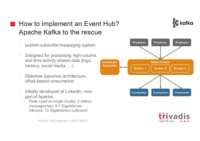 - 32. How to implement an Event Hub? Apache Kafka to the rescue • publish-subscribe messaging system • Designed for processing high-volume, real time activity stream data (logs, metrics, social media, …) • Stateless (passive) architecture, offset-based consumption • Initially developed at LinkedIn, now part of Apache • Peak Load on single cluster: 2 million messages/sec, 4.7 Gigabits/sec inbound, 15 Gigabits/sec outbound Reliable Data Ingestion in Big Data/IoT Kafka Cluster Consumer Consumer Consumer Producer Producer Producer Broker 1 Broker 2 Broker 3 Zookeeper Ensemble