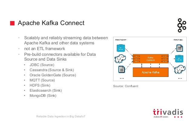 - 33. Apache Kafka Connect • Scalably and reliably streaming data between Apache Kafka and other data systems • not an ETL framework • Pre-build connectors available for Data Source and Data Sinks • JDBC (Source) • Cassandra (Source & Sink) • Oracle GoldenGate (Source) • MQTT (Source) • HDFS (Sink) • Elasticsearch (Sink) • MongoDB (Sink) Reliable Data Ingestion in Big Data/IoT Source: Confluent