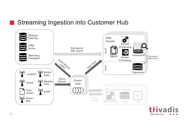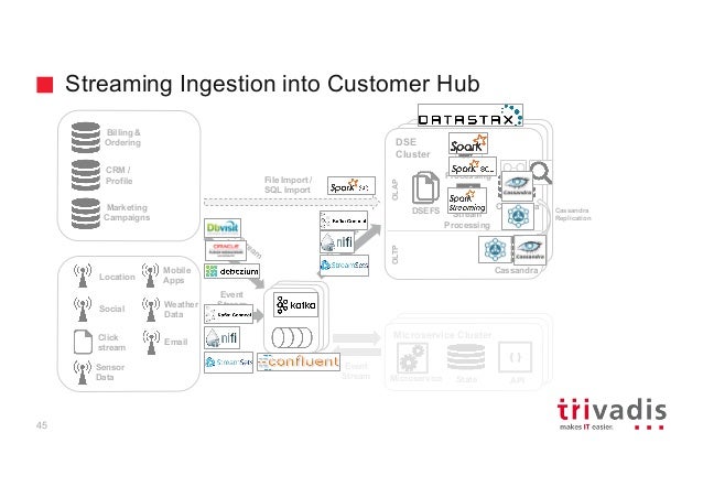- 35. Hadoop ClusterdHadoop Cluster DSE Cluster Streaming Ingestion into Customer Hub OLAP Microservice Cluster Microservice State { } API File Import / SQL Import OLTP Parallel Processing Cassandra Cassandra Stream Processing DSEFS Billing & Ordering CRM / Profile Marketing Campaigns Location Social Click stream Sensor Data Weather Data Mobile Apps Email Event Stream Event Hub Event Hub Event Hub Event Stream Cassandra Replication 44