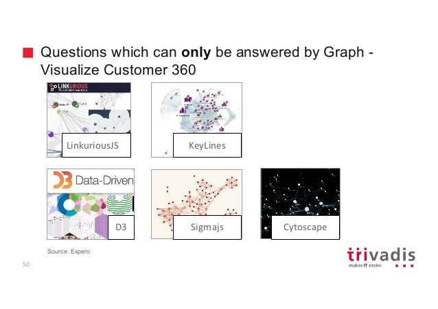 - 39. Questions which can only be answered by Graph - Visualize Customer 360 50 KeyLines Cytoscape LinkuriousJS SigmajsD3 Source: Expero