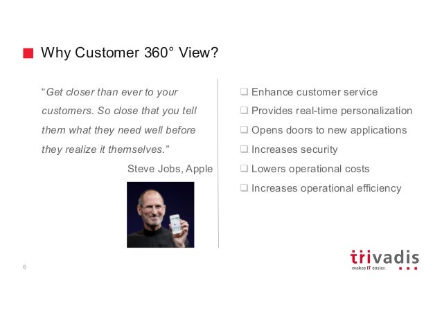 - 6. Why Customer 360° View? “Get closer than ever to your customers. So close that you tell them what they need well before they realize it themselves.” Steve Jobs, Apple q Enhance customer service q Provides real-time personalization q Opens doors to new applications q Increases security q Lowers operational costs q Increases operational efficiency 6