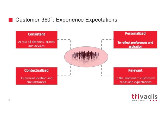 - 9. Customer 360°: Experience Expectations Consistent Across all channels, brands and devices Personalized To reflect preferences and aspiration Relevant In the moment to customer’s needs and expectations Contextualized To present location and circumstances 9
