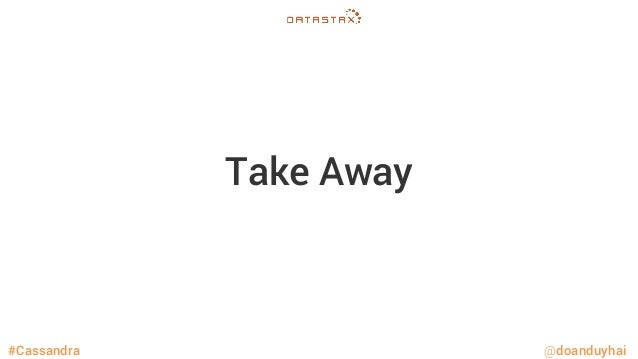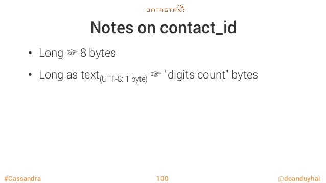 - 100. #Cassandra @doanduyhai Notes on contact_id • Long ☞ 8 bytes • Long as text(UTF-8: 1 byte) ☞ "digits count" bytes 100