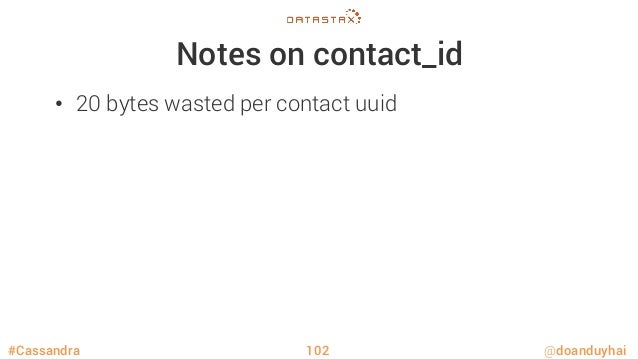 - 102. #Cassandra @doanduyhai Notes on contact_id • 20 bytes wasted per contact uuid 102