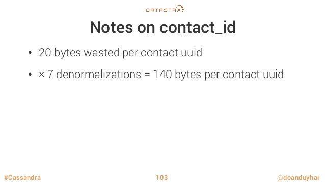 - 103. #Cassandra @doanduyhai Notes on contact_id • 20 bytes wasted per contact uuid • × 7 denormalizations = 140 bytes per contact uuid 103