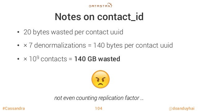 - 104. #Cassandra @doanduyhai Notes on contact_id • 20 bytes wasted per contact uuid • × 7 denormalizations = 140 bytes per contact uuid • × 109 contacts = 140 GB wasted 104 ???? not even counting replication factor …