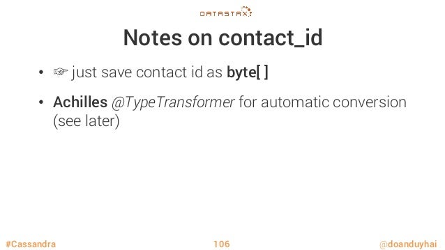 - 106. #Cassandra @doanduyhai Notes on contact_id • ☞ just save contact id as byte[ ] • Achilles @TypeTransformer for automatic conversion (see later) 106