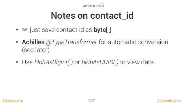 - 107. #Cassandra @doanduyhai Notes on contact_id • ☞ just save contact id as byte[ ] • Achilles @TypeTransformer for automatic conversion (see later) • Use blobAsBigInt( ) or blobAsUUID( ) to view data 107