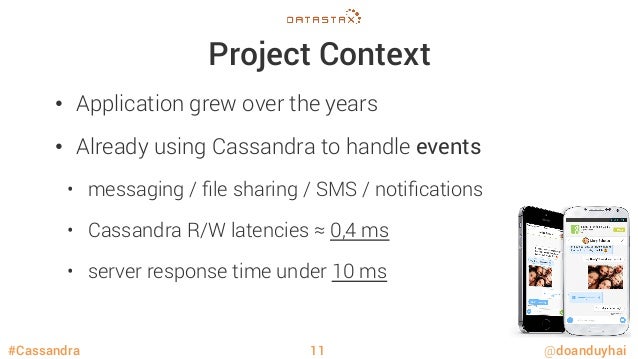 - 11. #Cassandra @doanduyhai Project Context • Application grew over the years • Already using Cassandra to handle events • messaging / file sharing / SMS / notifications • Cassandra R/W latencies ≈ 0,4 ms • server response time under 10 ms 11