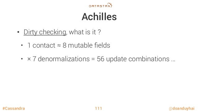 - 111. #Cassandra @doanduyhai Achilles • Dirty checking, what is it ? • 1 contact ≈ 8 mutable fields • × 7 denormalizations = 56 update combinations … 111