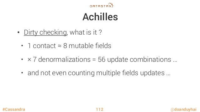 - 112. #Cassandra @doanduyhai Achilles • Dirty checking, what is it ? • 1 contact ≈ 8 mutable fields • × 7 denormalizations = 56 update combinations … • and not even counting multiple fields updates … 112