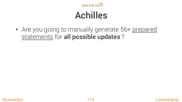- 113. #Cassandra @doanduyhai Achilles • Are you going to manually generate 56+ prepared statements for all possible updates ? 113