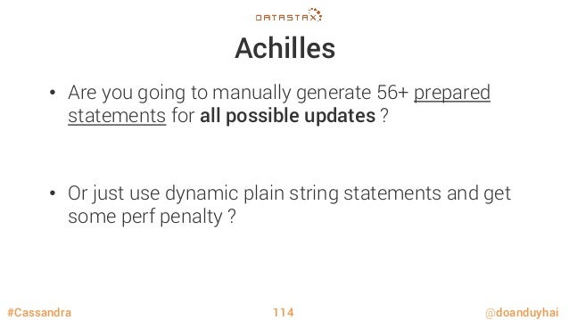 - 114. #Cassandra @doanduyhai Achilles • Are you going to manually generate 56+ prepared statements for all possible updates ? • Or just use dynamic plain string statements and get some perf penalty ? 114
