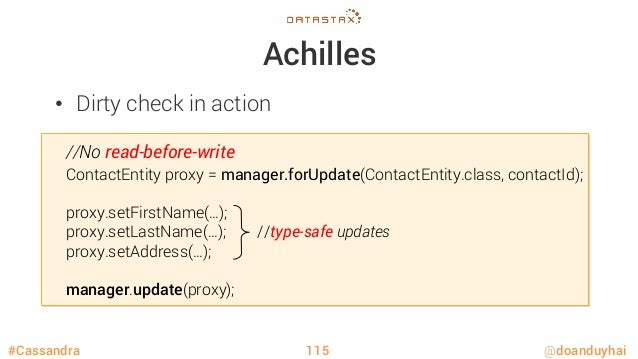 - 115. #Cassandra @doanduyhai Achilles • Dirty check in action 115 //No read-before-write ContactEntity proxy = manager.forUpdate(ContactEntity.class, contactId); proxy.setFirstName(…); proxy.setLastName(…); //type-safe updates proxy.setAddress(…); manager.update(proxy);