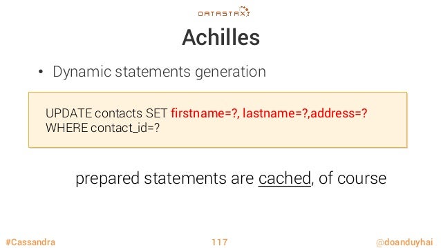 - 117. #Cassandra @doanduyhai Achilles • Dynamic statements generation 117 UPDATE contacts SET firstname=?, lastname=?,address=? WHERE contact_id=? prepared statements are cached, of course